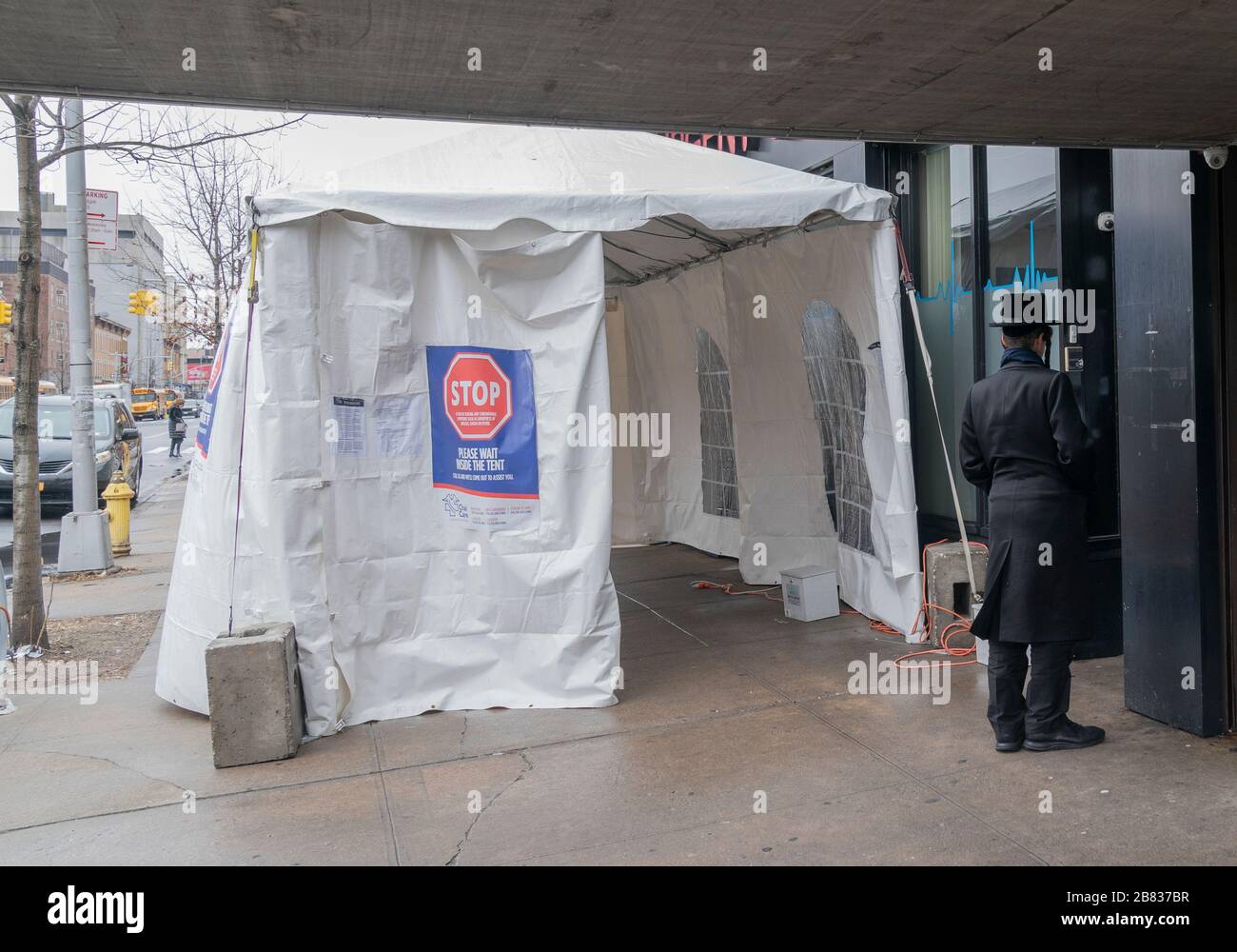 New York Ny March 19 2020 Hasidic Jewish Man Reads Signs Posted On Testing Site For Coronavirus At Chai Urgent Care Facility In Borough Park Area Of Brooklyn Stock Photo Alamy